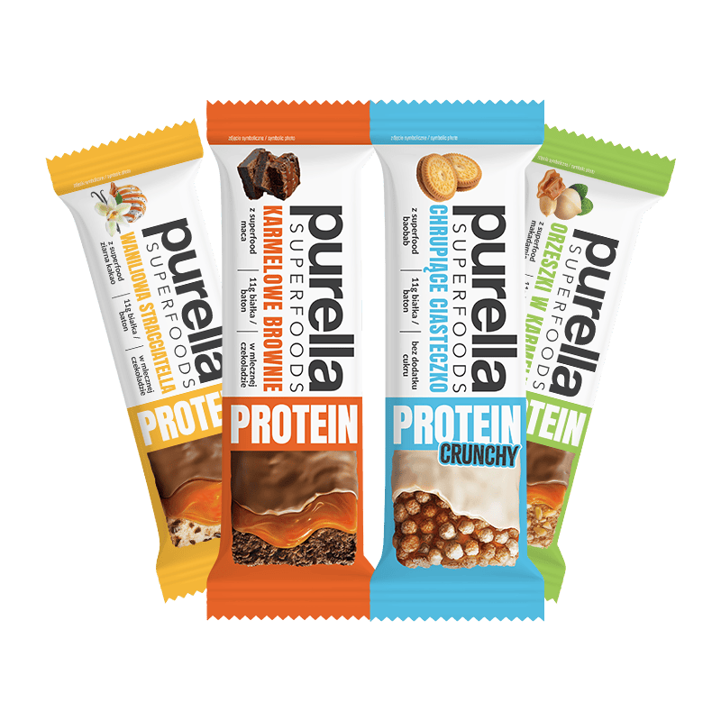Batony proteinowe Purella Crunchy to innowacyjna propozycja dla świadomych konsumentów, poszukujących produktu o wysokiej wartości odżywczej. Dzięki recepturze bogatej w białko (11 g / baton), bez dodatku cukru (<2 g / baton) maja one niski indeks glikemiczny, co potwierdziły badania in vivo w standardzie ISO 26642:2010. Batony wspierają budowę masy mięśniowej i procesy regeneracyjne organizmu, co czyni go idealnym wyborem dla osób prowadzących aktywny tryb życia oraz dbających o swoje zdrowie. Dzięki dodatkom superfoods, takim jak sproszkowany miąższ owoców baobabu czy jagody goji, batony dostarczają nie tylko białka, ale również cennych składników odżywczych i błonnika wspierającego metabolizm. Produkt nie zawiera dodatku cukru, co doskonale wpisuje się w trendy zdrowego odżywiania i czyni go przyjaznym wyborem zarówno dla osób aktywnych, jak i dbających o kontrolę spożycia cukrów. Batony są dostępne w czterech wyjątkowych wariantach smakowych, które spełniają oczekiwania różnorodnych preferencji klientów: Chrupiące Ciasteczko, Truskawkowa Beza, Mango Crispy Rice, Matcha&Yuzu. Purella Superfoods oferuje baton proteinowy jako zdrową, odżywczą przekąskę, która odpowiada na potrzeby nowoczesnych konsumentów, łącząc wyjątkowy smak z zaawansowanym profilem odżywczym.